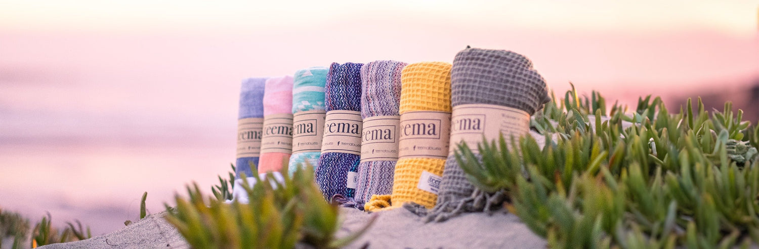 Teemas are flat woven, meaning they do not have exposed loops like terry cloth towels do. This means that Teemas use significantly less fabric, which makes them much lighter and faster drying than regular terry cloth towels.